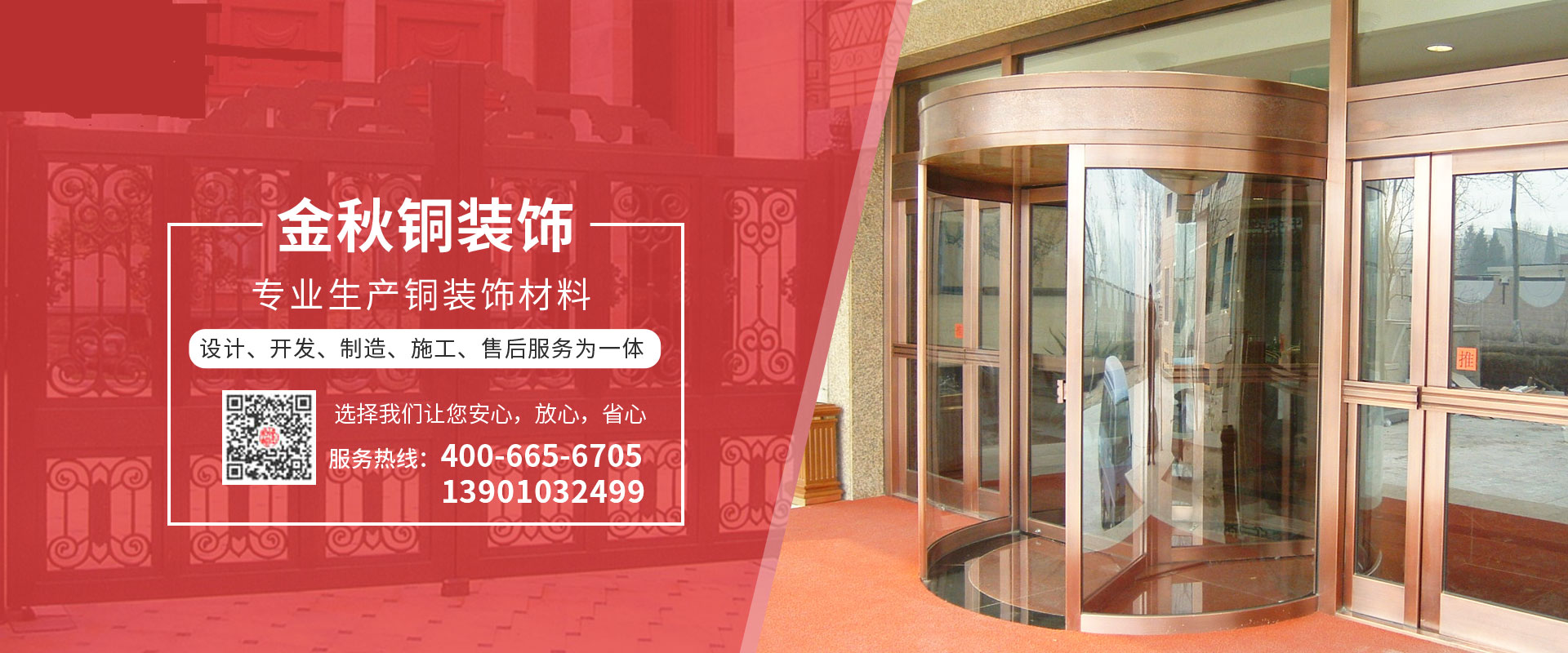 北京金秋銅裝飾材料有限公司是專業生產銅裝飾材料及設計、開發、制造、施工、售后服務為一體的大型綜合企業??沙薪咏ㄖ~裝飾工程及五星級酒店、別墅、博物館、樓樘管所等高檔銅裝飾項目;生產各種規格的旋轉門、平滑門、別墅門、電控門、工藝門、旋轉護欄、屋頂銅飾防水瓦、浮雕壁畫......